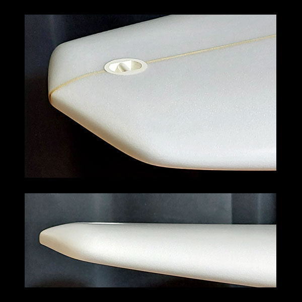 ラウンドピンテールよりもテール面積を広げられるので波のパワーやレスポンスを更に得られやすく、そしてハイレスポンスなラウンドスカッシュテールよりはラウンドピンのような食いつきの良さを見込めるデザイン。